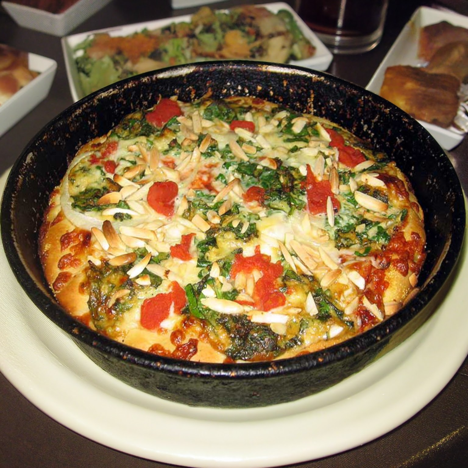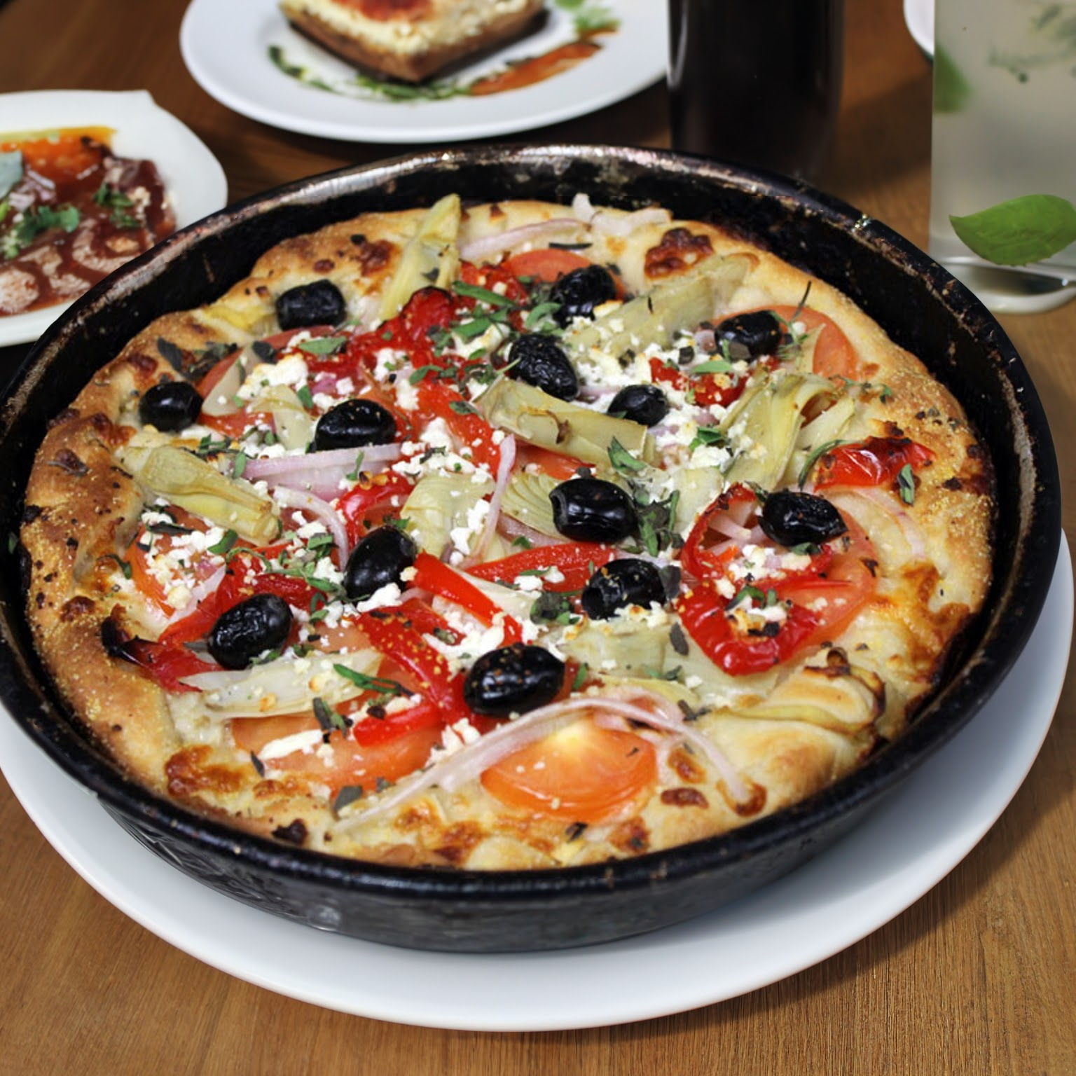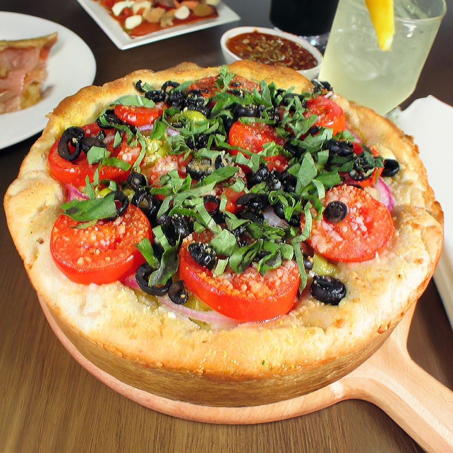 "My favorite spot for deep dish in the area! Classic pizza shop vibe with bakery items at the front. Plenty of seating even for large parties. Pizzas are super delicious and filling."